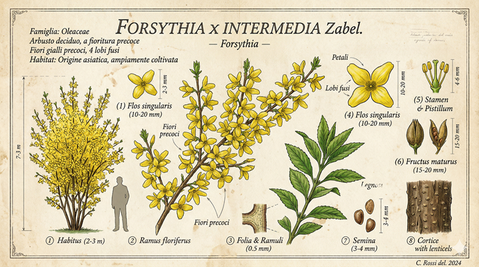 La Forsythia è un arbusto a fogliame deciduo che raggiunge un’altezza di 1-3 m. Le specie coltivate come piante ornamentali nei giardini sono siepi caratterizzate da corolle di un colore giallo brillante che sbocciano con fiori a gruppetti di tre all’inizio della primavera. Sono estremamente decorative e di forte impatto visivo.