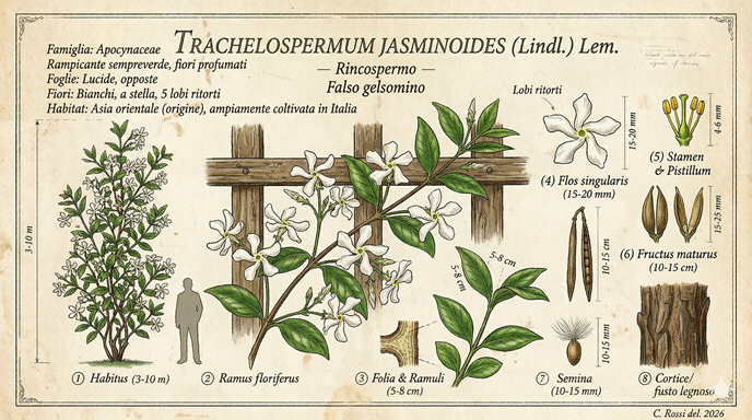 Il Rincospermo, detto anche Rincospermum o Falso Gelsomino (nome latino Trachelospermum jasminoides) è un arbusto rampicante e vigorosissimo, produce lunghi tralci almeno in parte volubili che si allungano fino a 10-12 mt; si distingue nettamente dai Gelsomini per le foglie intere, oblunghe, molto spesse e coriacee.