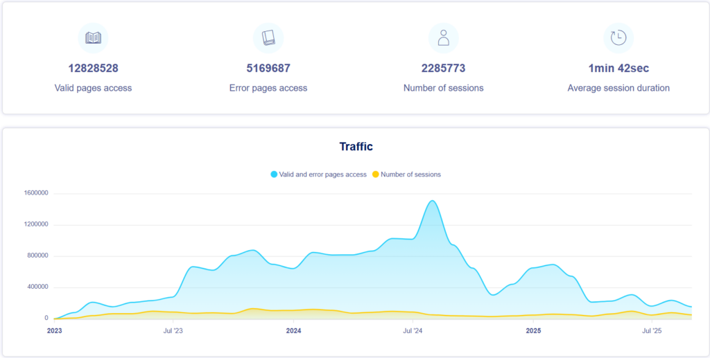 – REPORT OVH STATISTICS BG 3.2 (16.02/29.09 2023): 2.153.000 accessi validi da 523.000 visitatori. Il 7/8 punta di 83.888 visite tra valid and error access, il 12 e il 20/9 superate le 80.000.